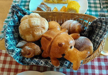 こちら朝食のパン。後ろにちょっと写っているパンケーキも格別ながら、パンもいろいろ種類ありどれも美味しい!あ、書き忘れましたがお部屋は山小屋風、お風呂は貸し切りタイプです。マスターが気さくな方で家族写真撮って頂きました。