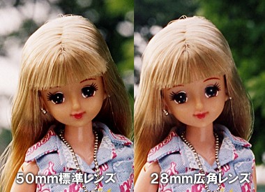こんどは下の写真を見てください。レンズを28mmの「広角」レンズに変えまして、お人形の位置は変えずに、さきほどの50mmのときと同じ大きさに写るようにカメラをお人形に近付けて撮影しました。ですからカメラからお人形までは30cmほどまで近づいています。